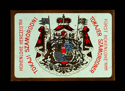 Bortípus: szamorodni; Termelő neve: Hohenlohe Keresztély; Termelő címe: Bodrogkeresztúr; Évjárat: 1908 körül; színes címke;