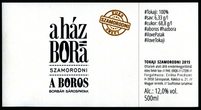 Bortípus: szamorodni; Termelő neve: Ciróka Pincészet; Termelő címe: 3950 Sárospatak, Rákóczi u. 21.; Évjárat: 2015; színes címke