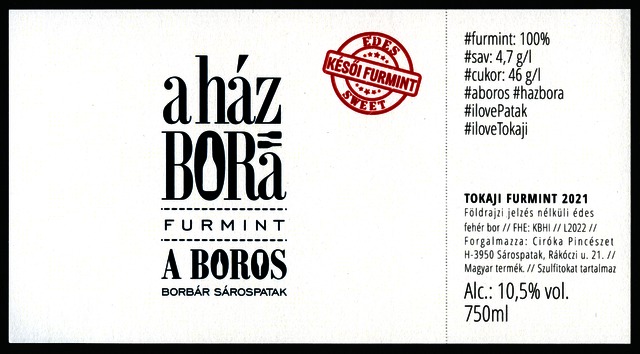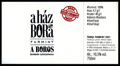 Bortípus: furmint; Termelő neve: Ciróka Pincészet; Termelő címe: 3950 Sárospatak, Rákóczi u. 21.; Évjárat: 2021; színes címke