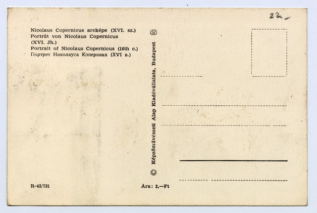 | További információk: | Képeslap (carte maximum) Szabados László gyűjteményéből. Emlékülés a Tudományos Akadémián Kopernikusz születésének 500. évfordulóján. Képzőművészeti Alap Kiadóvállalata, Budapest. R-43/731 | ||||||