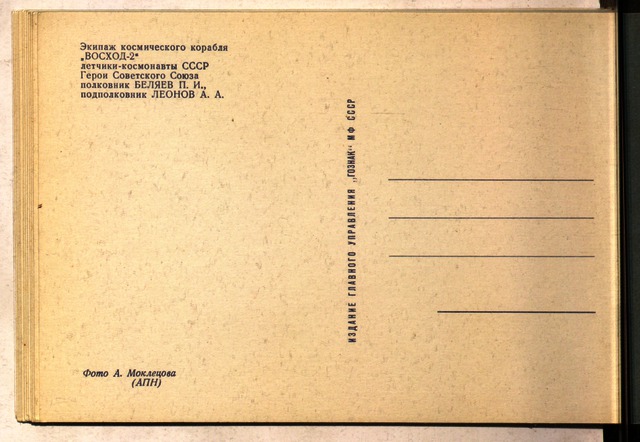 A Voszhod–2 űrhajót 1965. március 18-án indították egy napnál valamivel tovább tartó Föld körüli útjára, fedélzetén Pavel Ivanovics Beljajev (1925–1970) parancsnokkal és Alekszej Arhipovics Leonov (1934–2019) mérnökkel. Az út során Leonov hajtotta végre az első űrsétát a zsilipkamrával felszerelt Voszhod–2 űrhajóból az űrbe kilépve. Leonov második űrrepülése szintén történelmi alkalom volt, az első szovjet–amerikai űrprogram, a Szojuz–Apollo-program szovjet űrhajójának parancsnoka volt 1975-ben. | On 18 March 1965, the Voskhod-2 spacecraft was launched on a slightly longer than one-day orbital trip around the Earth with Commander Pavel Ivanovich Belyayev (1925-1970) and Engineer Alexei Arkhipovich Leonov (1934-2019) on board. During the voyage, Leonov performed the first spacewalk (EVA, extravehicular activity), leaving the Voskhod-2 spacecraft through an airlock chamber into space. Leonov's second spaceflight was also a historic occasion, as commander of the first Soviet spacecraft of the first Soviet-American space programme, the Soyuz-Apollo programme, in 1975.