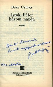Beke, György (Egyéb): Beke György dedikációja Benkő Samunak az Istók Péter három napja című munkájában [címlap és dedikáció]. (Publikálatlan) (1977)