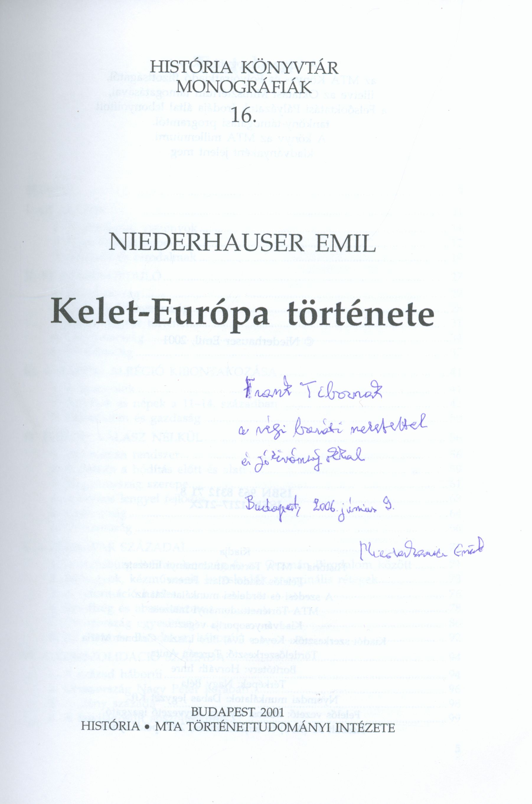 Niederhauser, Emil (Egyéb): Niederhauser Emil dedikációja Frank Tibornak a Kelet-Európa története című munkájában [címlap és dedikáció]. (Publikálatlan) (2006)