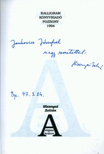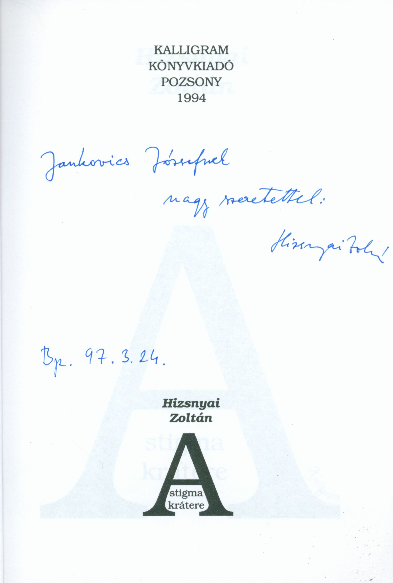 Hizsnyai, Zoltán (Egyéb): Hizsnyai Zoltán dedikációja Jankovics Józsefnek A stigma krátere című munkájában [címlap és dedikáció]. (Publikálatlan) (1997)