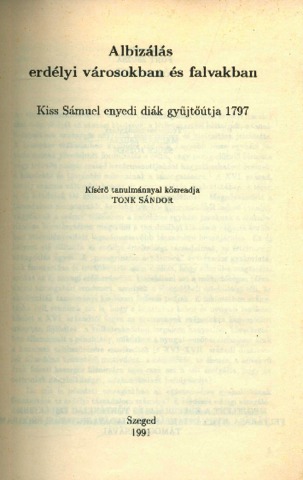 Tonk, Sándor (Egyéb): Tonk Sándor dedikációja Jankovics Józsefnek az Albizálás erdélyi városokban és falvakban : Kiss Sámuel enyedi diák gyűjtőútja 1797 című munkájában [címlap és dedikáció]. (Publikálatlan) (1991)
