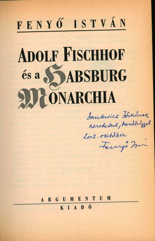Fenyő, István (Egyéb): Fenyő István dedikációja Jankovics Józsefnek az Adolf Fischhof és a Habsburg Monarchia című kötetben [címlap és dedikáció]. (Publikálatlan) (2002)