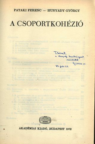 Hunyady, György (Egyéb): Hunyady György dedikációja Frank Tibornak Pataki Ferenc, Hunyady György: A csoportkohézió című munkájában [címlap és dedikáció]. (Publikálatlan) (1973)