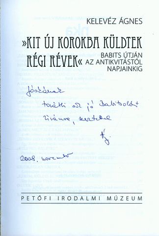 Kelevéz, Ágnes (Egyéb): Kelevéz Ágnes dedikációja Jankovics Józsefnek a "Kit új korokba küldtek régi révek" : Babits útján az antikvitástól napjainkig című munkájában [címlap és dedikáció]. (Publikálatlan) (2008)