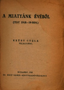 MEGHATÁROZATLAN (MEGHATÁROZATLAN): Dedikáció Krúdy Gyula: A Miatyánk évéből : Pest 1918 - 1919-ben : Krúdy Gyula feljegyzései című munkájában Frank Tibor könyvtárából [címlap és dedikáció]. (Publikálatlan) (1922)