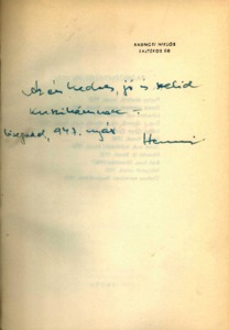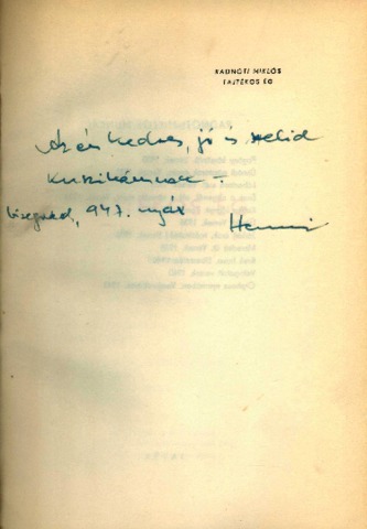 MEGHATÁROZATLAN (MEGHATÁROZATLAN): Dedikáció Radnóti Miklós: Tajtékos ég : versek című munkájában Frank Tibor könyvtárából [címlap és dedikáció]. (Publikálatlan) (1947)