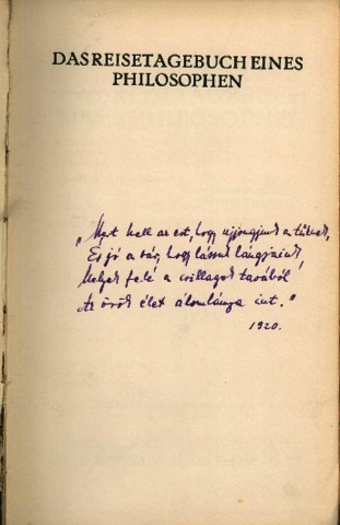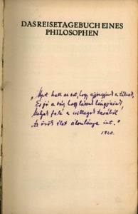Dedikáció Hermann Keyserling: Das Reisetagebuch eines Philosophen című munkájában Frank Tibor könyvtárából [címlap és dedikáció]