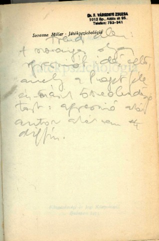 MEGHATÁROZATLAN (MEGHATÁROZATLAN): Dedikáció Susanna Millar: Játékpszichológia című munkájában (ford. Koós Anna) Frank Tibor könyvtárából [címlap és dedikáció]. (Publikálatlan) (1973)