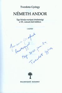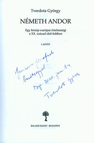 Tverdota, György (Egyéb): Tverdota György dedikációja Jankovics Józsefnek a Németh Andor 1., Egy közép európai értelmiségi a XX. század első felében című munkájában [címlap és dedikáció]. (Publikálatlan) (2010)