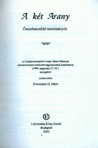 Szörényi, László (Egyéb): Szörényi László dedikációja Jankovics Józsefnek A két Arany : összehasonlító tanulmányok : a Csonka-toronybeli Arany János Múzeum centenáriumára rendezett nagyszalontai konferencia (1999. augusztus 27-29.) anyagából című kötetben [címlap és dedikáció]. (Publikálatlan) (2002)