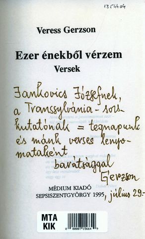 Veress, Gerzson (Egyéb): Veress Gerzson dedikációja Jankovics Józsefnek az Ezer énekből vérzem : versek című kötetében[címlap és dedikáció]. (Publikálatlan) (1995)