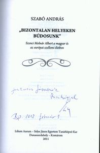 Szabó András dedikációja Jankovics Józsefnek a "Bizontalan helyeken búdosunk" : Szenci Molnár Albert a magyar és az európai szellemi életben című munkájában [címlap és dedikáció]