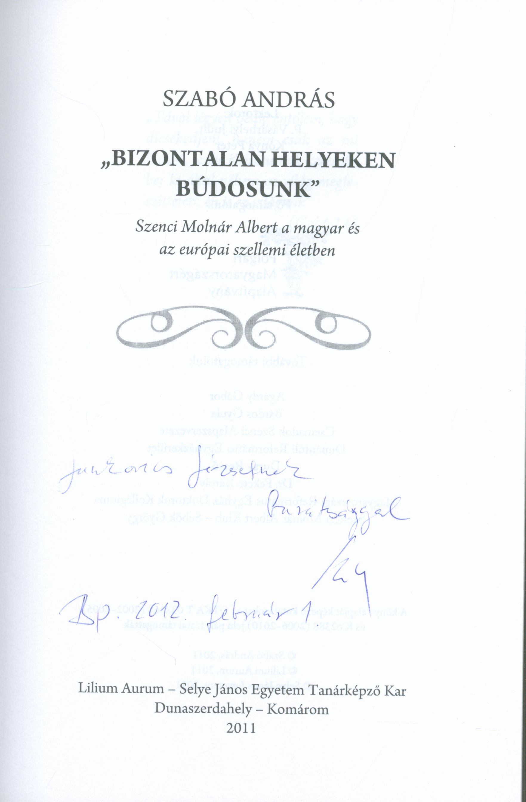Szabó, András (Egyéb): Szabó András dedikációja Jankovics Józsefnek a "Bizontalan helyeken búdosunk" : Szenci Molnár Albert a magyar és az európai szellemi életben című munkájában [címlap és dedikáció]. (Publikálatlan) (2012)