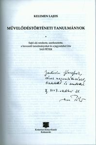 Sas, Péter (Egyéb): Sas Péter dedikációja Jankovics Józsefnek Kelemen Lajos: Művelődéstörténeti tanulmányok I. című kötetben [címlap és dedikáció]. (Publikálatlan) (2007)