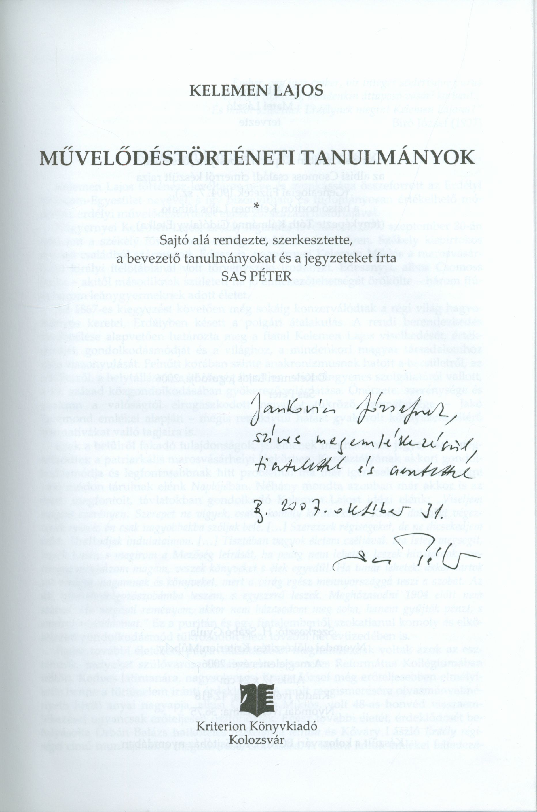 Sas, Péter (Egyéb): Sas Péter dedikációja Jankovics Józsefnek Kelemen Lajos: Művelődéstörténeti tanulmányok I. című kötetben [címlap és dedikáció]. (Publikálatlan) (2007)