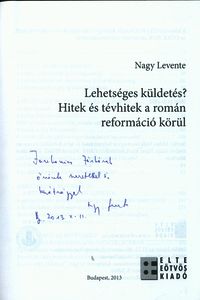 Nagy, Levente (Egyéb): Nagy Levente dedikációja Jankovics Józsefnek a Lehetséges küldetés? Hitek és tévhitek a román reformáció körül című művében [címlap és dedikáció]. (Publikálatlan) (2013)