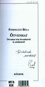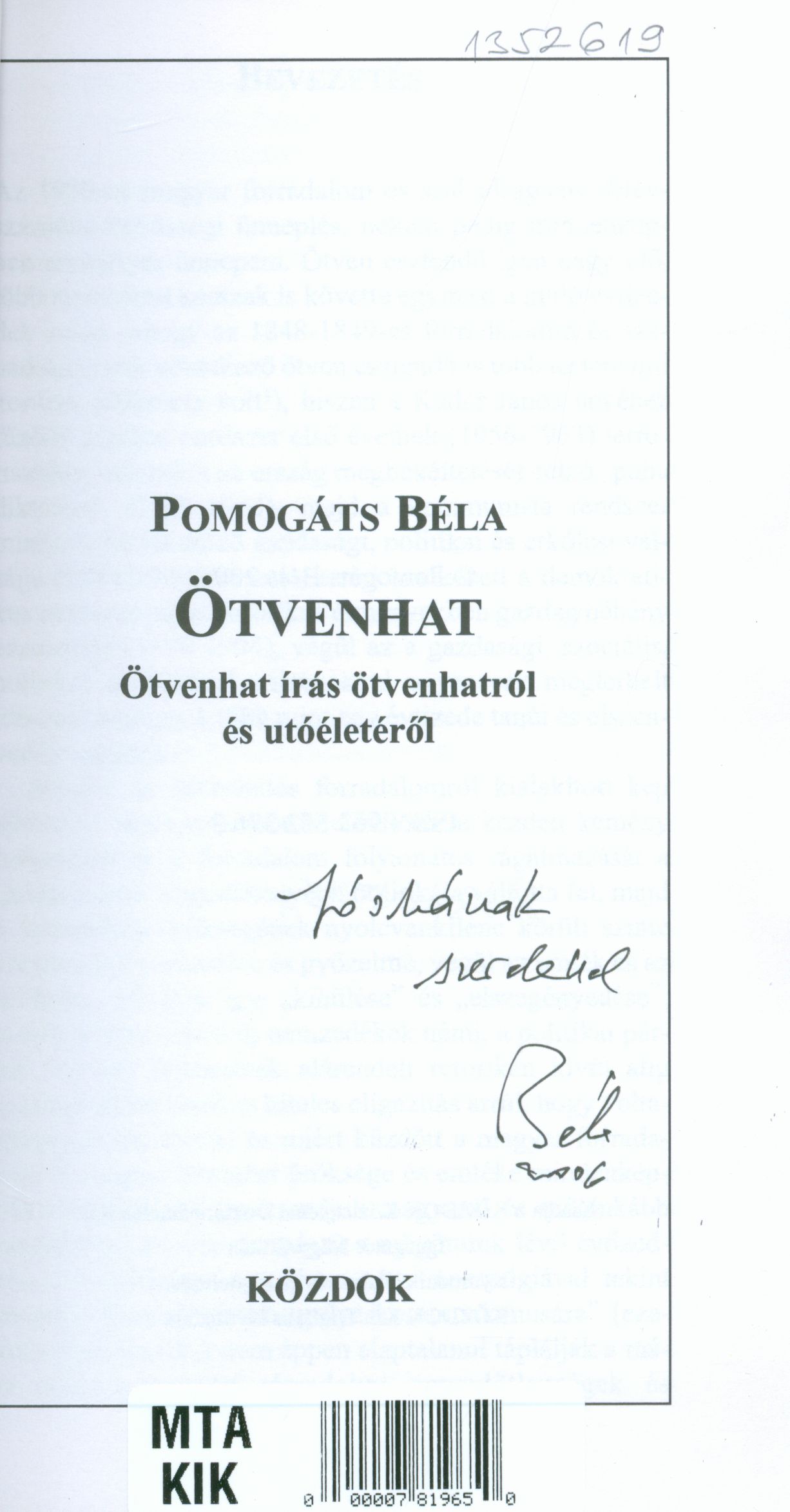 Pomogáts, Béla (Egyéb): Pomogáts Béla dedikációja Jankovics Józsefnek az Ötvenhat : ötvenhat írás ötvenhatról és utóéletéről című kötetben [címlap és dedikáció]. (Publikálatlan) (2006)