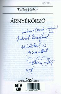 Tallai, Gábor (Egyéb): Tallai Gábor dedikációja Jankovics Józsefnek az Árnyékőrző című kötetben [címlap és dedikáció]. (Publikálatlan) (1998)