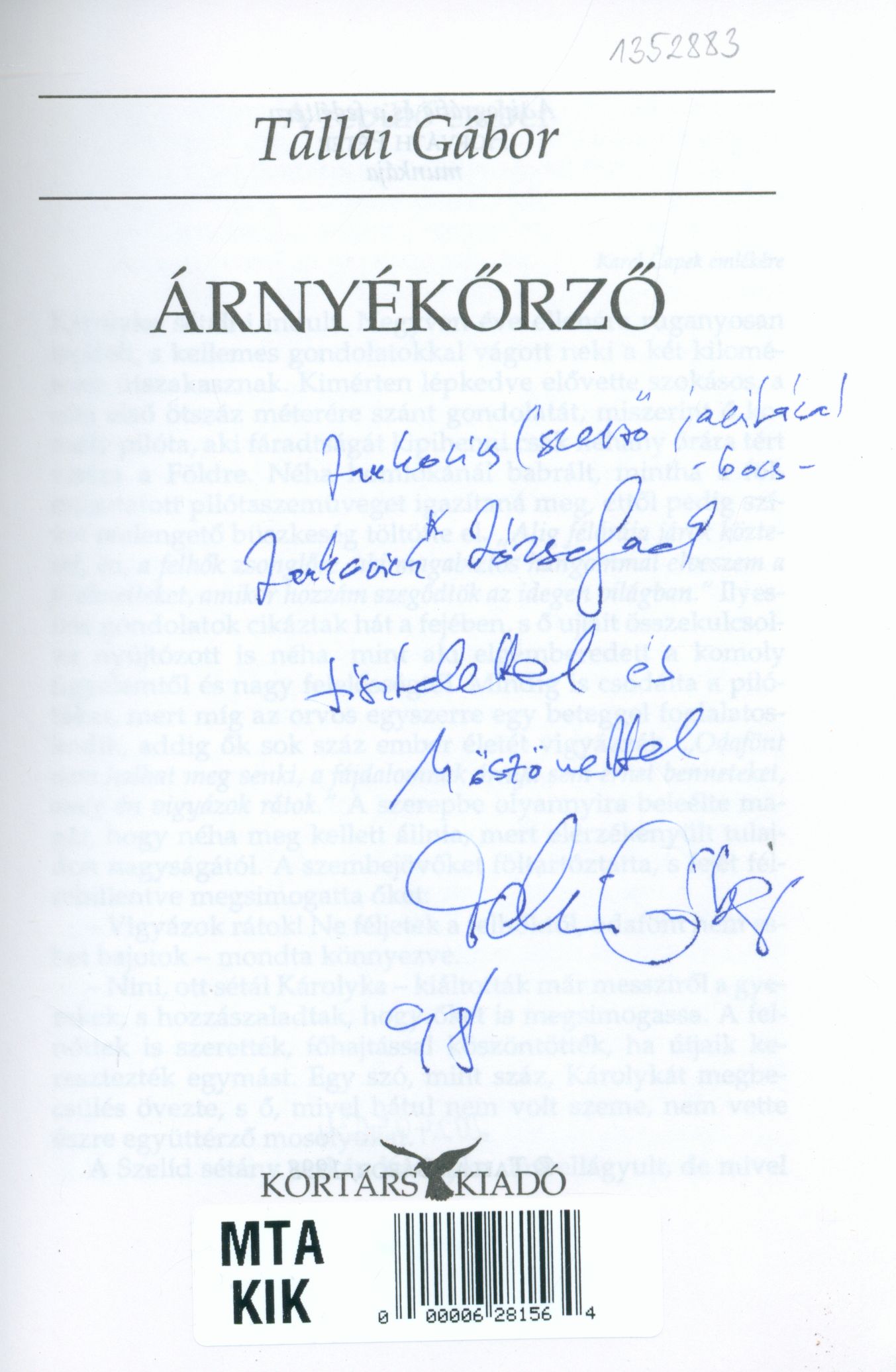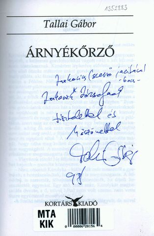 Tallai, Gábor (Egyéb): Tallai Gábor dedikációja Jankovics Józsefnek az Árnyékőrző című kötetben [címlap és dedikáció]. (Publikálatlan) (1998)