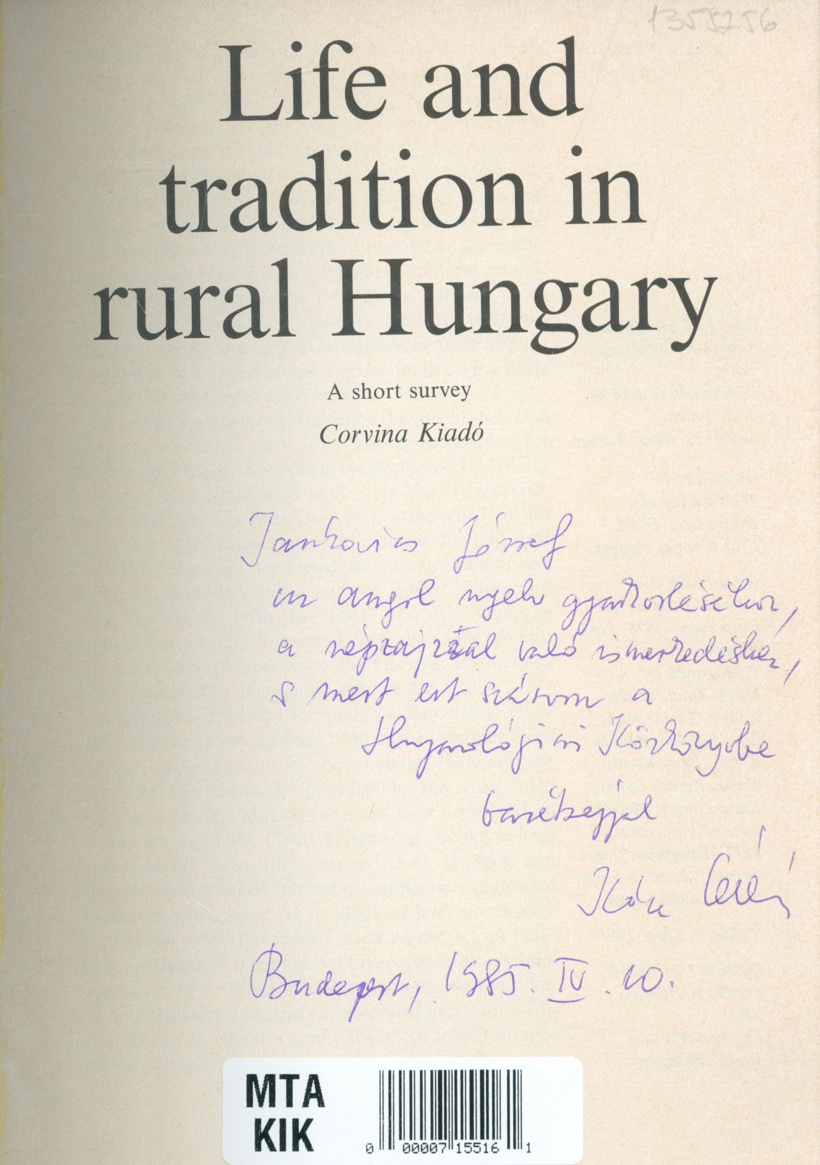 Kósa, László (Egyéb): Kósa László dedikációja Jankovics Józsefnek a Life and tradition in rural Hungary : a short survey című művében [címlap és dedikáció]. (Publikálatlan) (1985)