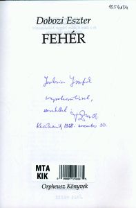MEGHATÁROZATLAN (MEGHATÁROZATLAN): Dedikáció Jankovics Józsefnek Dobozi Eszter: Fehér című művében [címlap és dedikáció]. (Publikálatlan) (1998)
