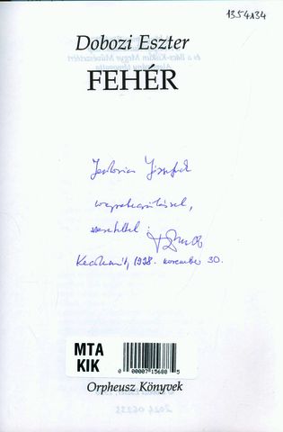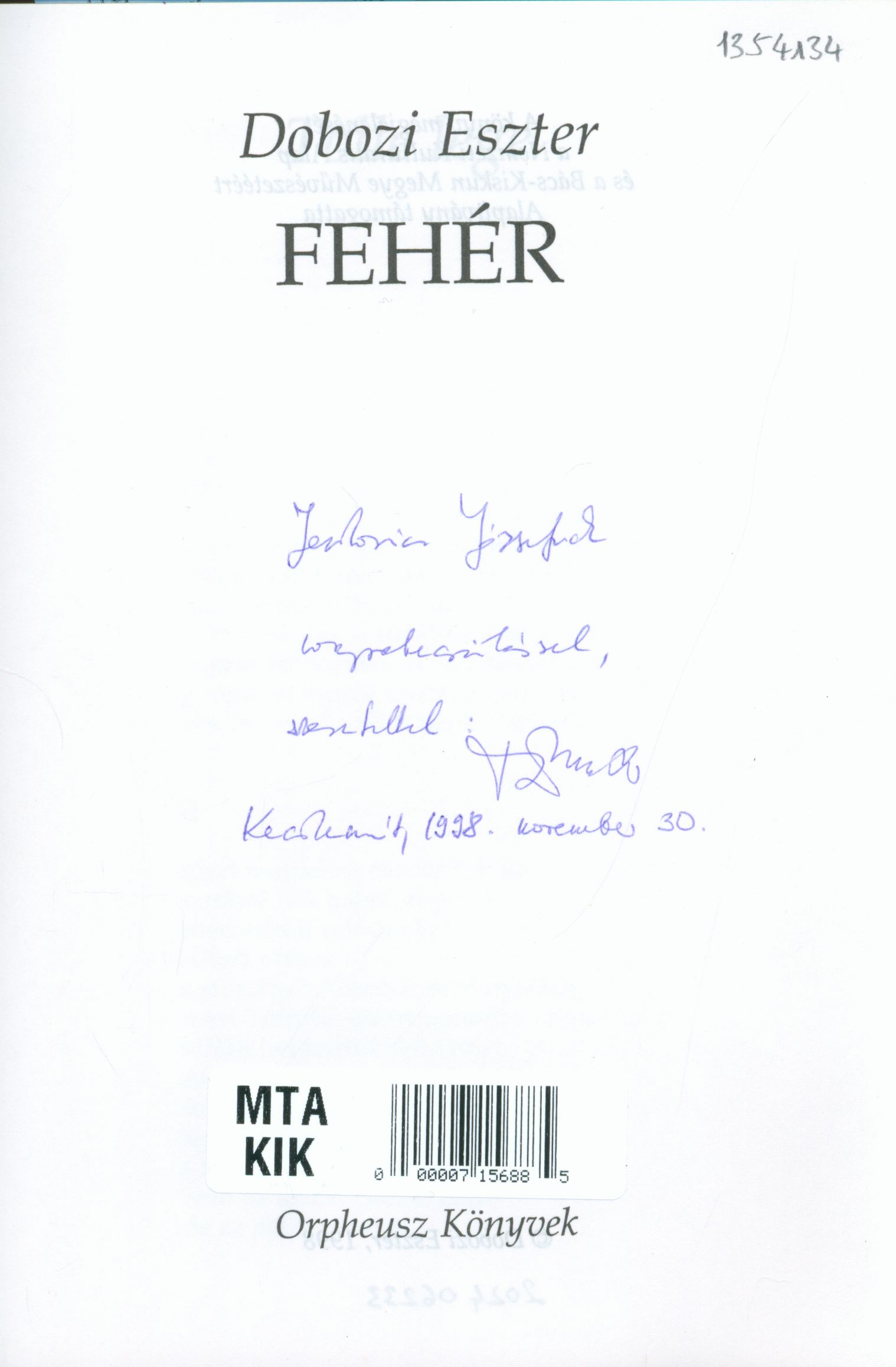 MEGHATÁROZATLAN (MEGHATÁROZATLAN): Dedikáció Jankovics Józsefnek Dobozi Eszter: Fehér című művében [címlap és dedikáció]. (Publikálatlan) (1998)