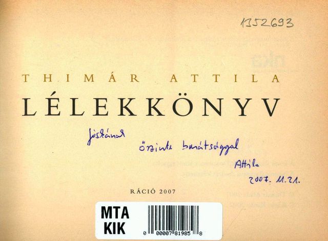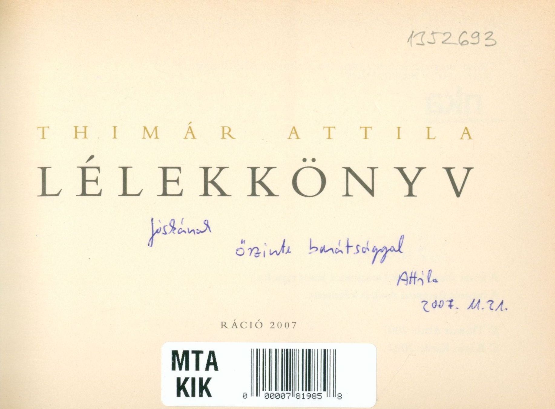 Thimár, Attila (Egyéb): Thimár Attila dedikációja Jankovics Józsefnek a Lélekkönyv című kötetben[címlap és dedikáció]. (Publikálatlan) (2007)