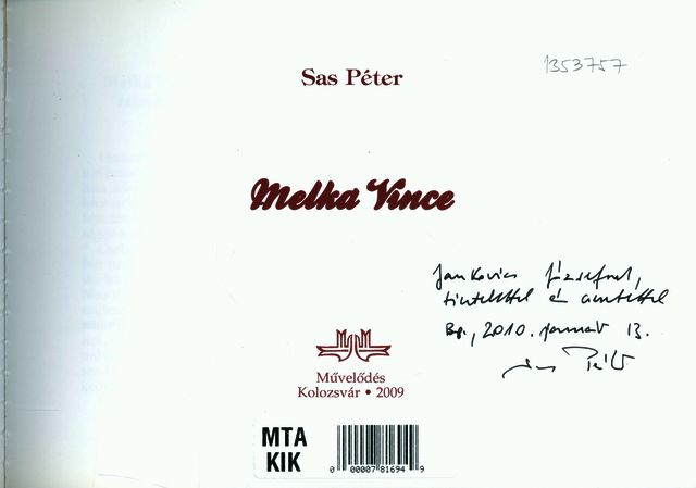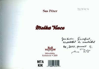 Sas, Péter (Egyéb): Sas Péter dedikációja Jankovics Józsefnek a Melka Vince című művében [címlap és dedikáció]. (Publikálatlan) (2010)