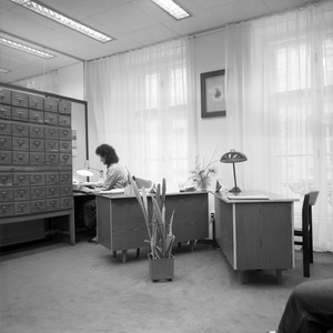 A könyvtári munkahelyekről készített felvételek 1989. januárjában. D 9789, D 9790, D 9791, D 9792, D 9795, D 9825, D 9826, D 9827, D 9828, D 9831, D 9832: IV. emelet, Főigazgatói szoba. Ebből a részből alakították ki a mai (2025) kis tárgyalószobát. D 9793, D 9794, D 9796, D 9797, D 9798: II. emelet, Informatika. D 9799, D 9800, D 9829, D 9830, D 9845: IV. emelet, Főigazgatói szoba másik fele (ez a mai, 2025 főigazgatói szoba). D 9801, D 9802, D 9803, D 9804, D 9805, D 9806, D 9807, D 9808, D 9809, D 9810: Olvasóterem. D 9811, D 9812: III. emelet, Csere (a képen Kiss Ildikó könyvtáros). D 9813, D 9814: IV. emelet, A főigazgató helyettes szobájának előtere. D 9815, D 9816, D 9817: IV. emelet, A főigazgató helyettes szobája. D 9819, D 9820, D 9821, D 9822: IV. emelet, A főigazgatói szoba előtere. D 9823, D 9824: Előtér. D 9833, D 9834: III. emeleti szoba. D 9835, D 9836, D 9837, D 9838, D 9839, D 9840, D 9841, D 9842, D 9843, D 9844: III. emeleti folyosó részlete.
