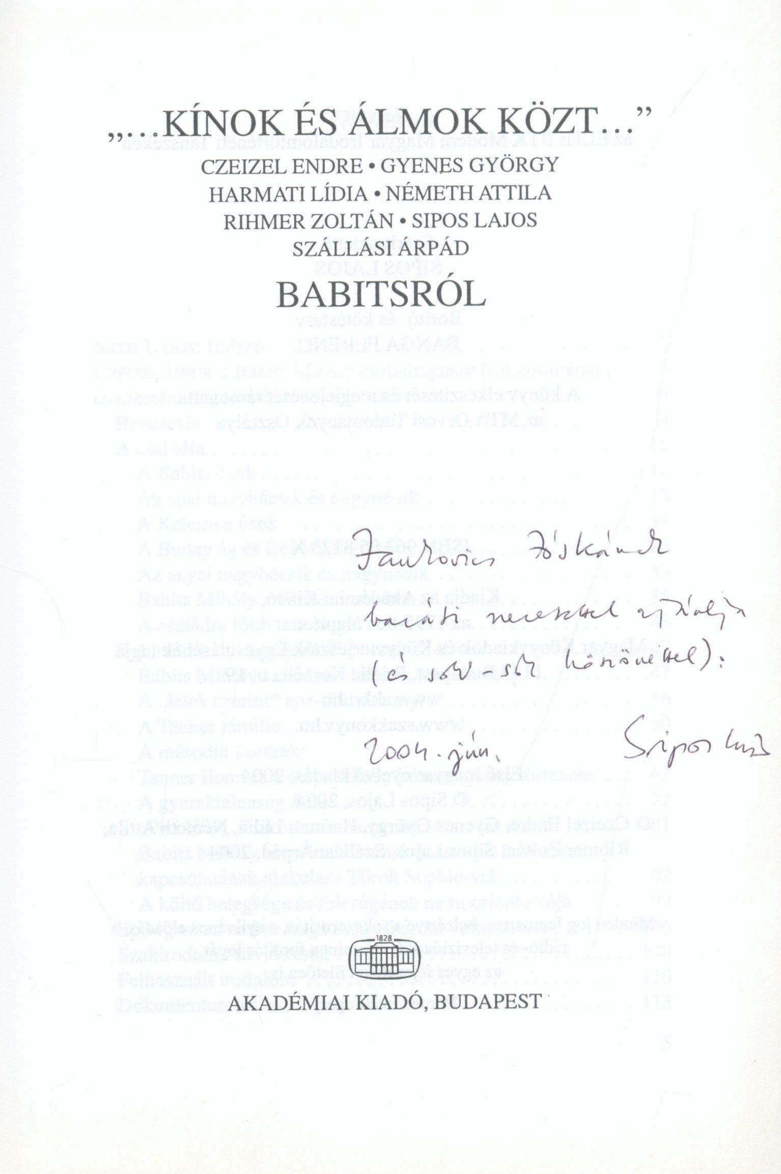 Sipos Lajos dedikációja Jankovics Józsefnek a "...kínok és álmok közt..." : Czeizel Endre, Gyenes György, Harmati Lídia, Németh Attila, Rihmer Zoltán, Sipos Lajos, Szállási Árpád Babitsról című kötetben [címlap és dedikáció]