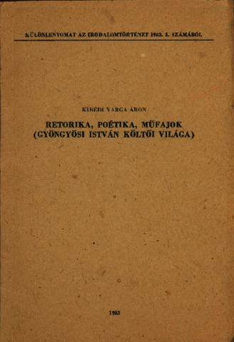 | További információk: | A Jankovics József hagyatéki könyvtárából származó példányt az MTA Könyvtár és Információs Központ nem vette fel állományába. A hagyatéki könyvtárról szóló ismertetőt ld. https://real-ms.mtak.hu/30582. A különlenyomat a Retorika, poétika, műfajok : Gyöngyösi István költői világa című tanulmányt tartalmazza. | ||||||