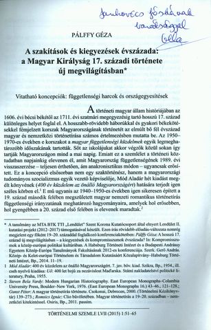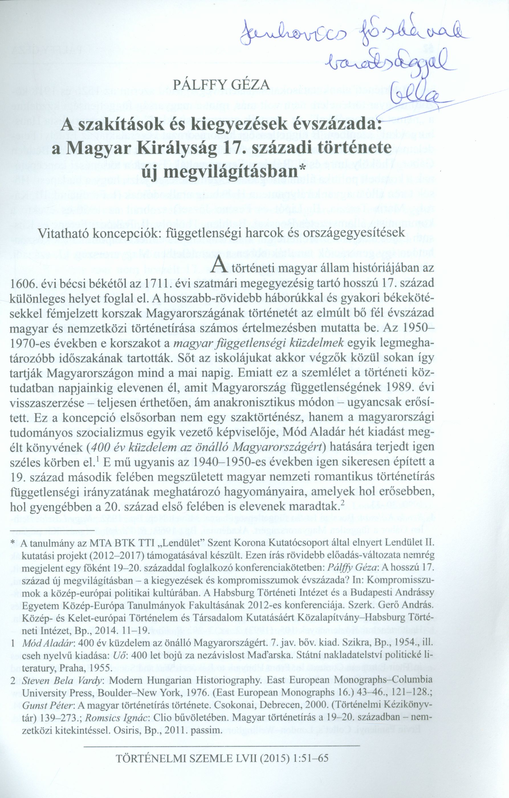 Pálffy, Géza (Egyéb): Pálffy Géza dedikációja Jankovics Józsefnek a Történelmi Szemle 57. kötetének 1. számának különlenyomatában [címlap és dedikáció]. (Publikálatlan) (2015)