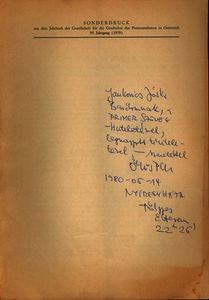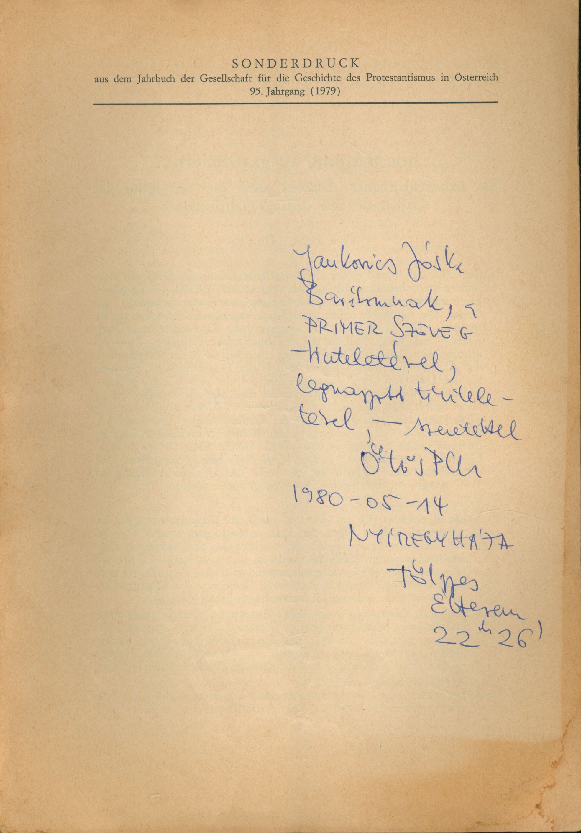 Ötvös, Péter (Egyéb): Ötvös Péter dedikációja Jankovics Józsefnek a Jahrbuch der Gesellschaft für die Geschichte des Protestantismus in Österreich 95. Jahrgang (1979) különlenyomatában [címlap és dedikáció]. (Publikálatlan) (1980)