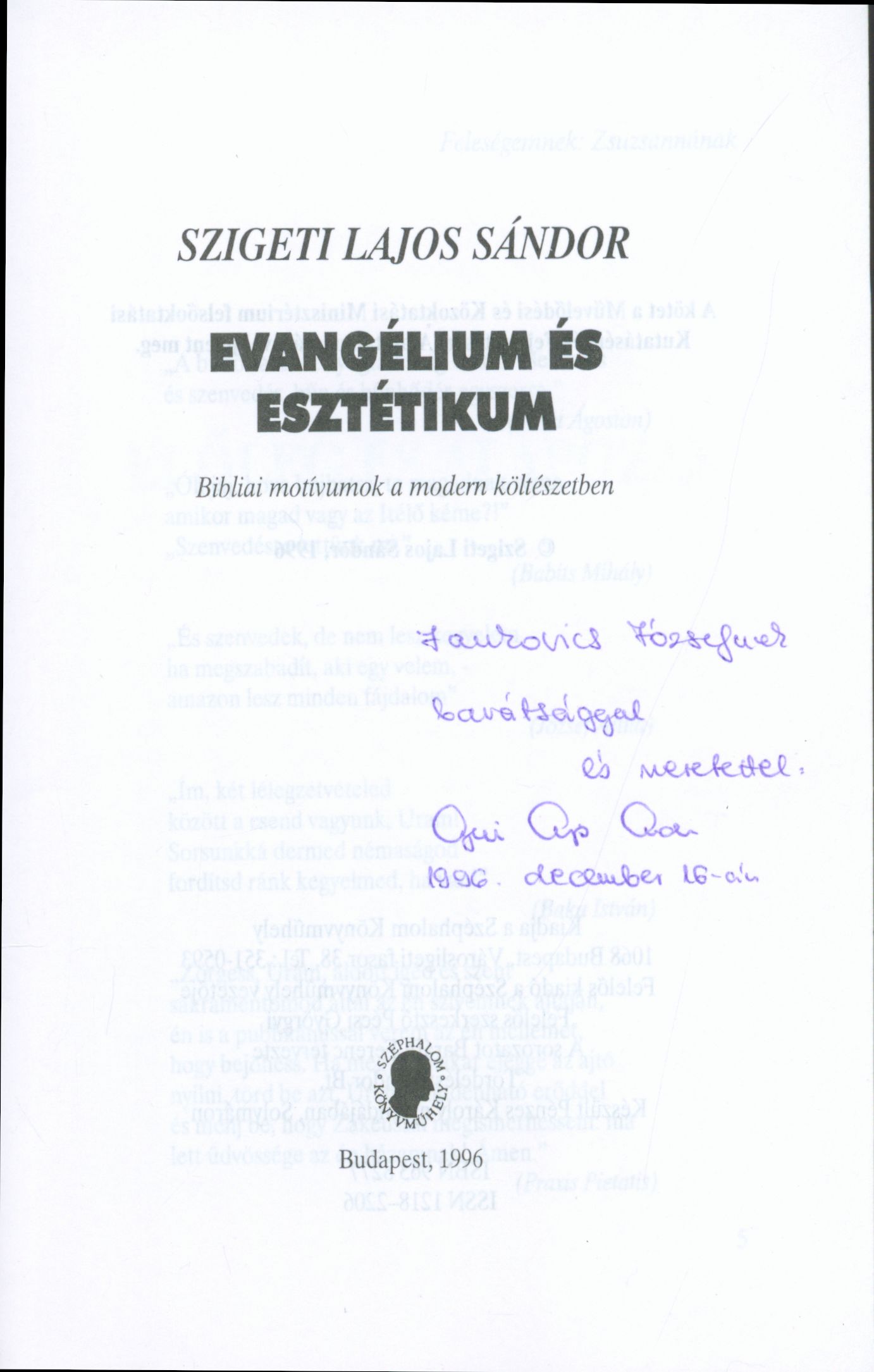 Szigeti, Lajos Sándor (Egyéb): Szigeti Lajos Sándor dedikációja Jankovics Józsefnek az Evangélium és esztétikum : Bibliai motívumok a modern költészetben című munkájában [címlap és dedikáció]. (Publikálatlan) (1996)