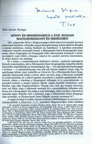 Tóth, István György (Egyéb): Tóth István György dedikációja Jankovics Józsefnek a Könyv és misszionárius a XVII. századi Magyarországon és Erdélyben című fejezetben [címlap és fejezet]. (Publikálatlan) (2001)