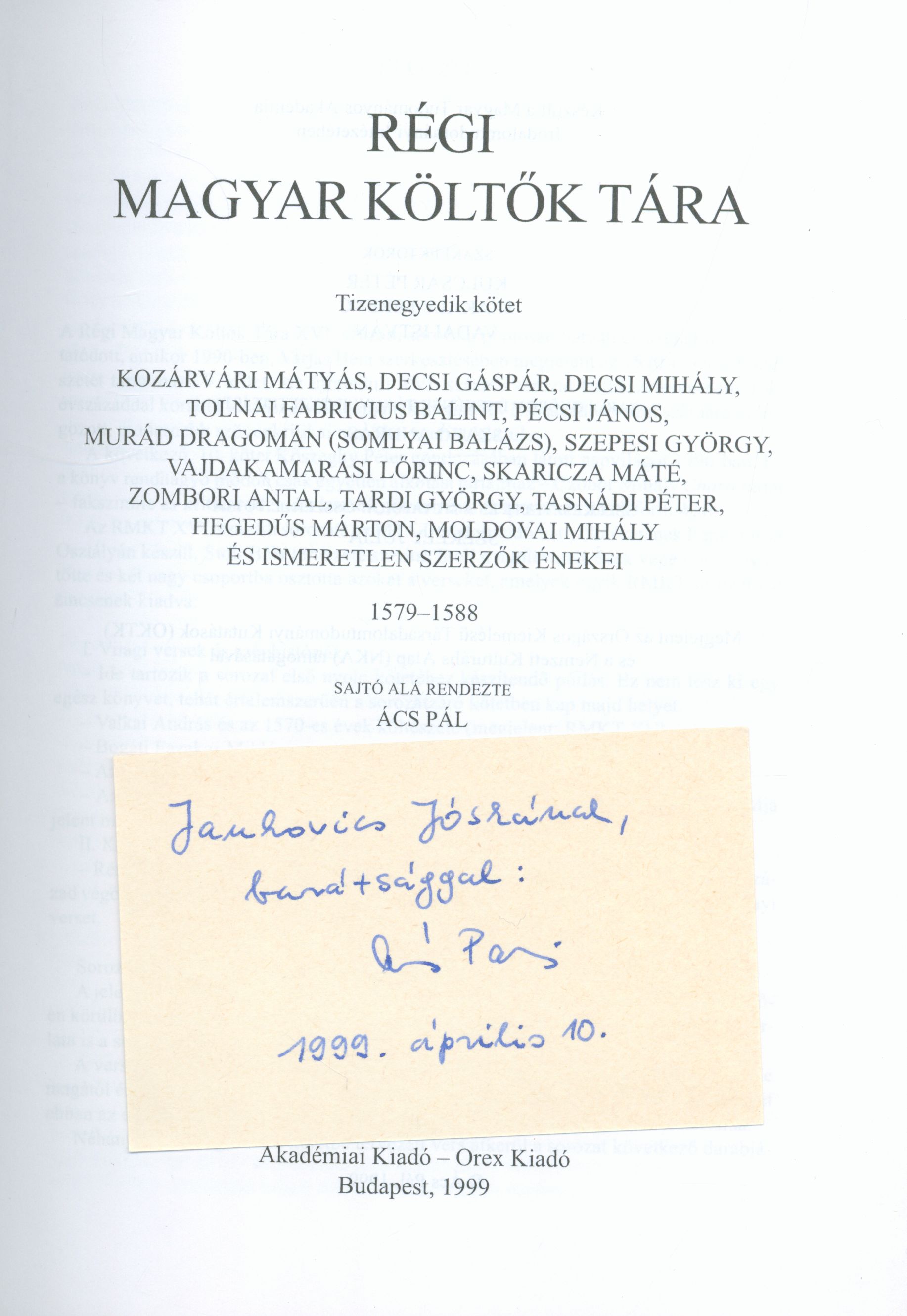 Ács, Pál (Egyéb): Ács Pál dedikációja Jankovics Józsefnek a Régi magyar költők tára 11. kötetében [címlap és dedikáció]. (Publikálatlan) (1999)