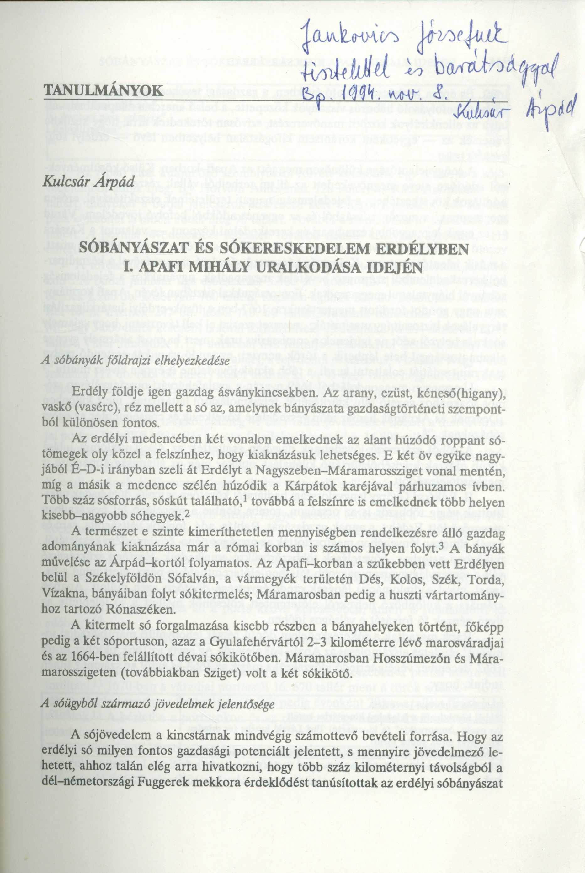 Kulcsár, Árpád (Egyéb): Kulcsár Árpád dedikációja Jankovics Józsefnek a Székelyföldi sóbányászat és sókereskedelem a kezdetektől a 17. század elejéig fejezetben [címlap és dedikáció]. (Publikálatlan) (1994)