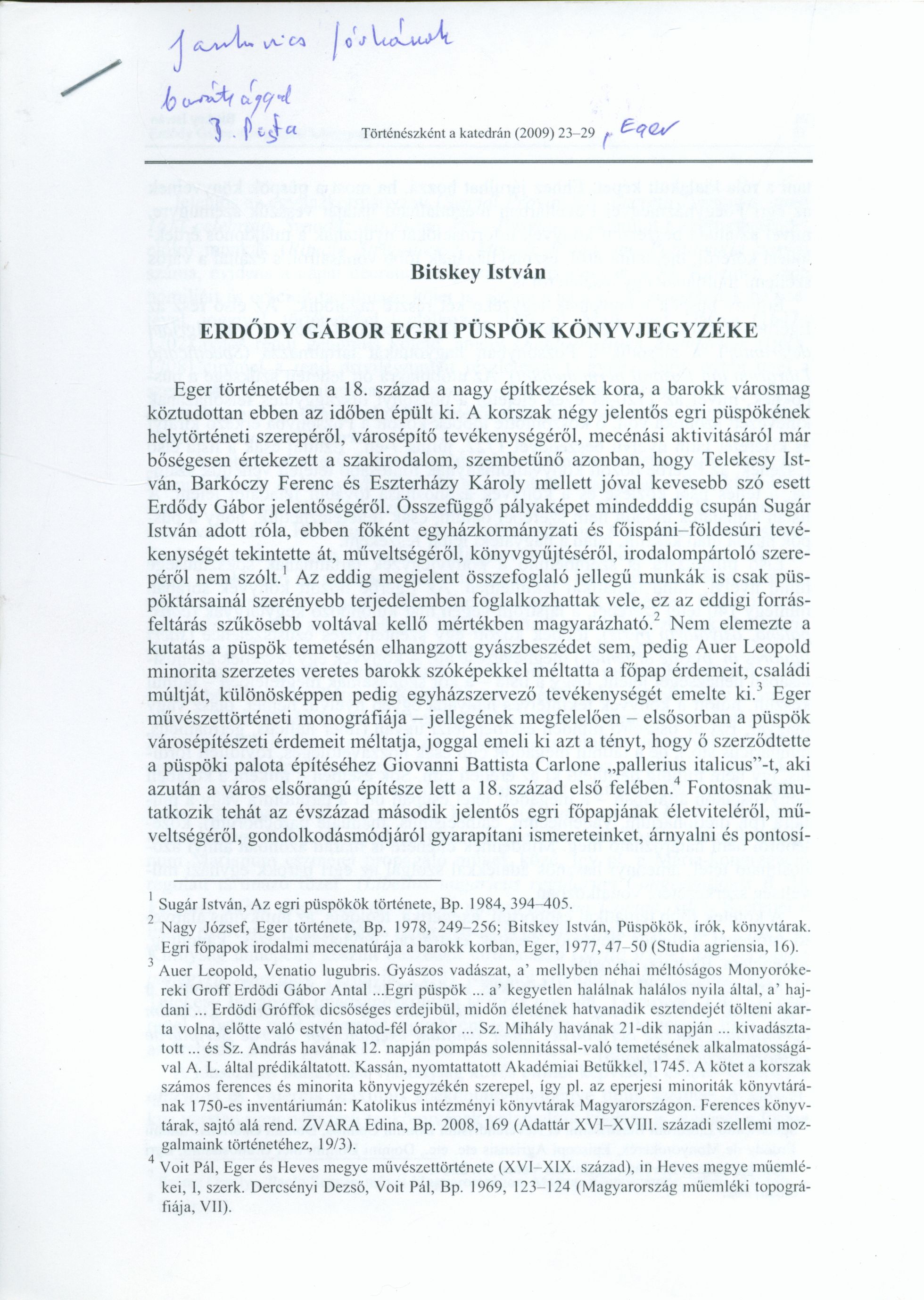 Bitskey, István (Egyéb): Bitskey István dedikációja Jankovics Józsefnek az Erdődy Gábor egri püspök könyvjegyzéke fejezetének különlenyomatában [címlap és dedikáció]. (Publikálatlan) (2009)
