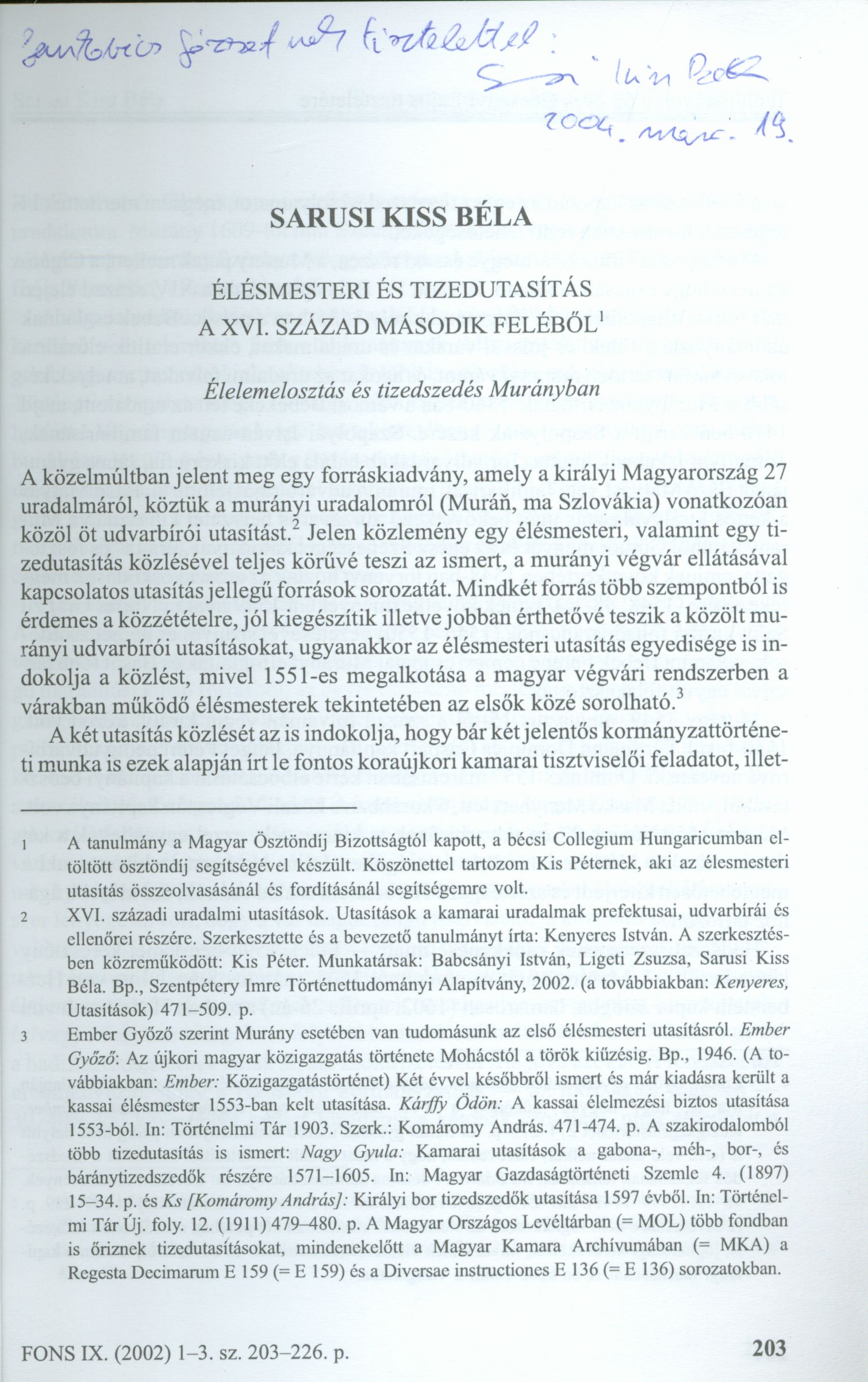 Sarusi Kiss, Béla (Egyéb): Sarusi Kiss Béla dedikációja Jankovics Józsefnek a Fons 9. évfolyamának különlenyomatában [címlap és dedikáció]. (Publikálatlan) (2000)