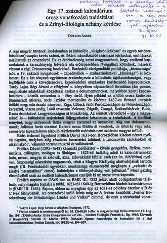 Dukkon, Ágnes (Egyéb): Dukkon Ágnes dedikációja Jankovics Józsefnek az Egy 17. századi kalendárium orosz vonatkozású tudósításai és a Zrínyi-filológia néhány kérdése című tanulmány különlenyomatában [címlap és dedikáció]. (Publikálatlan) (1997)