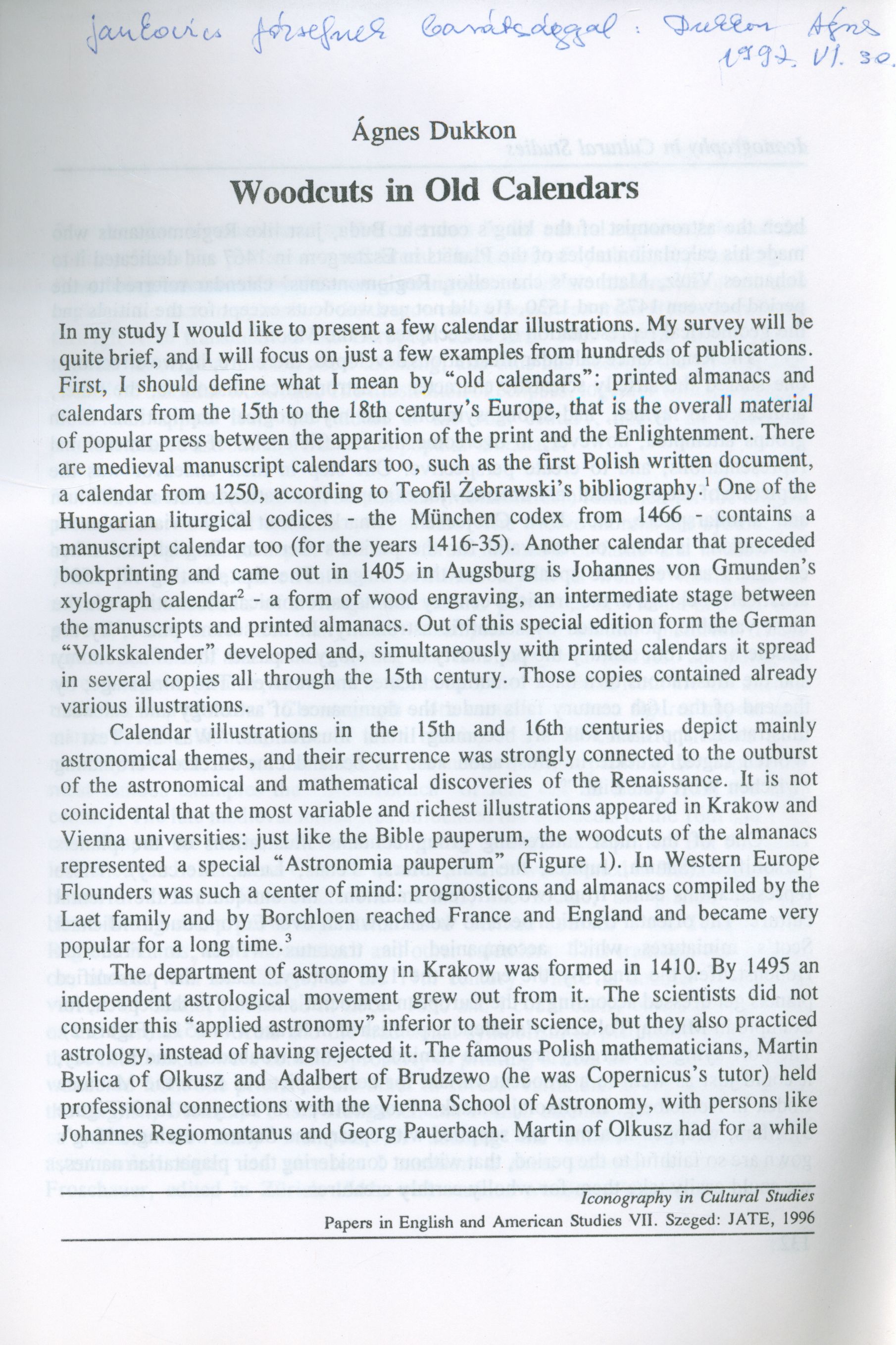 Dukkon, Ágnes (Egyéb): Dukkon Ágnes dedikációja Jankovics Józsefnek a Woodcuts in Old Calendars fejezetben [címlap és dedikáció]. (Publikálatlan) (1997)