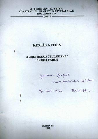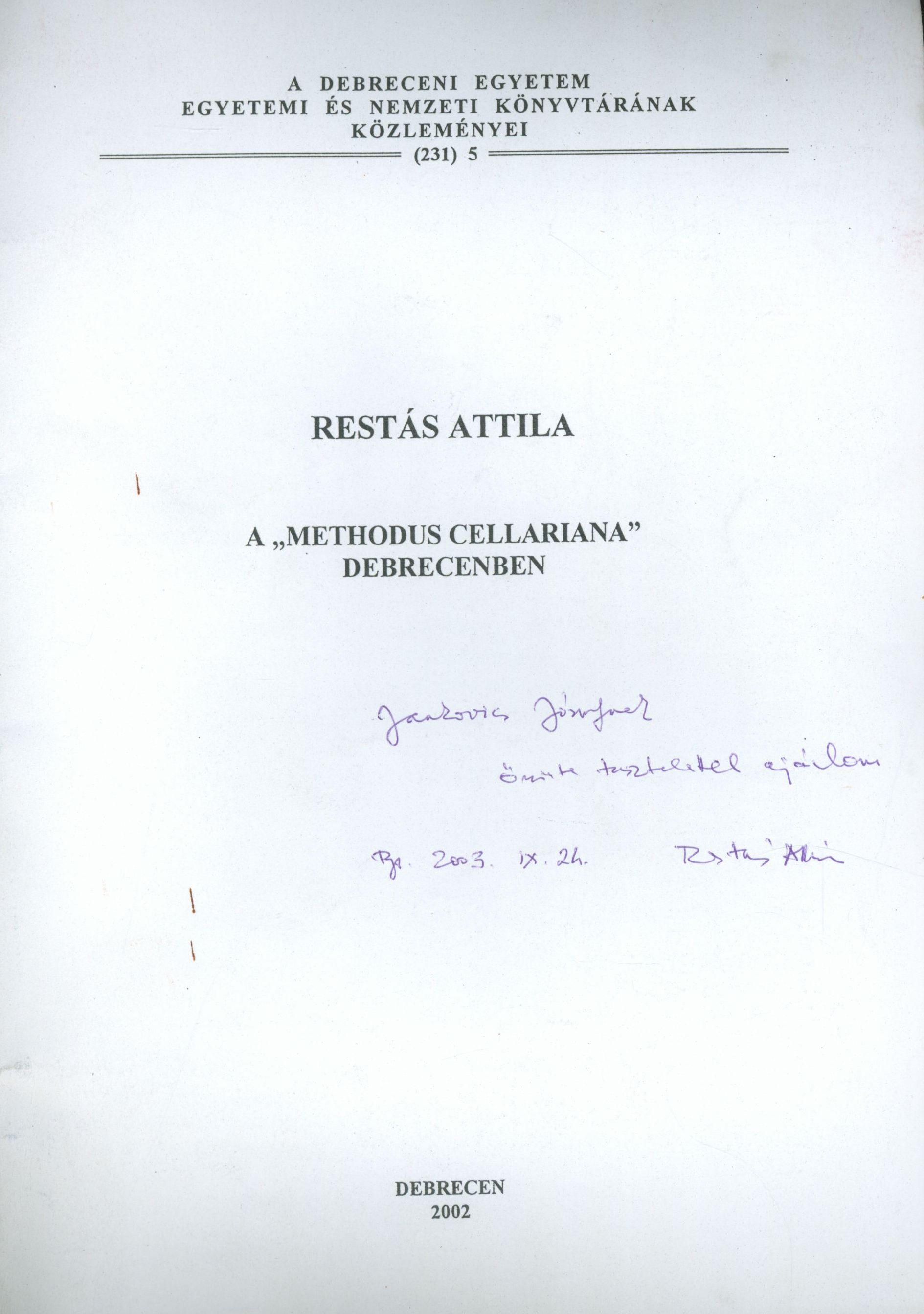 Restás, Attila (Egyéb): Restás Attila dedikációja Jankovics Józsefnek a Debreceni Egyetem Egyetemi és Nemzeti Könyvtárának Közleményei 231/5. számának különlenyomatában [címlap és dedikáció]. (Publikálatlan) (2003)