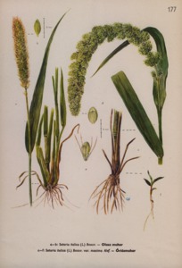 Setaria italica (L.) Beauv. - Olasz muhar; Setaria italica (L.) Beauv. var. maxima Alef. - Óriásmuhar.
