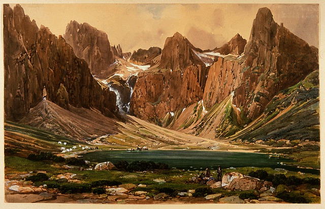 Ceruza, akvarell, papír, 316 x 495 mm | J.n.; felirat j.l.: 54 [?] Felirat a hordozó kartonon b.l.: Zöldtó Kárpátokban | A Zöld-tó partján pihenő társaság, odébb juhok. A hegyekhez közelebb jöttünk, és változott a megvilágítás. Baloldalt szürkének látjuk a Fecske-tornyot, a jobb szélen magasodik a Karbunkulus-torony.